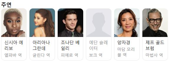 이번 영화에는 아리아나 그란데, 신시아 에리보, 조나단 베일리, 에단 슬레이터, 양자경, 제프 골드브럼 등 유명한 배우들이 출연합니다. 아리아나 그란데는 엘파바 역을 맡아 그녀의 뛰어난 가창력을 선보일 예정이며, 신시아 에리보는 글린다 역을 맡아 두 캐릭터 간의 복잡한 관계를 잘 표현할 것입니다.